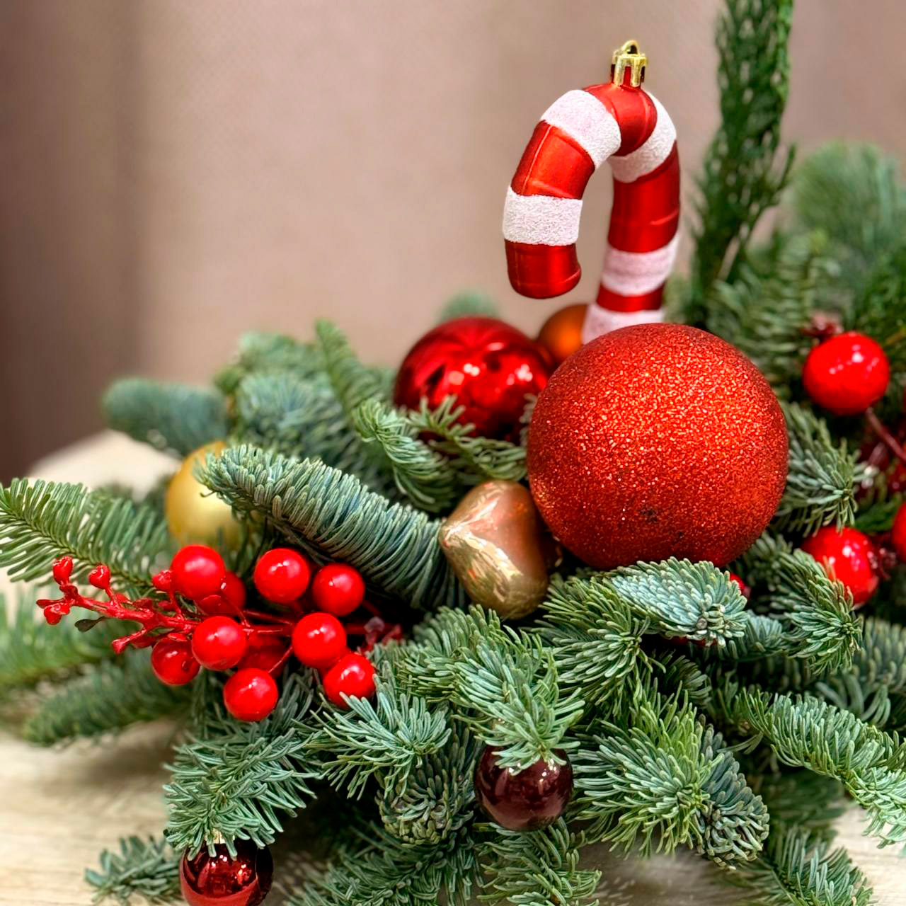 Состав: илекс, пихта, новогодний декор, подставка и флористическая губка