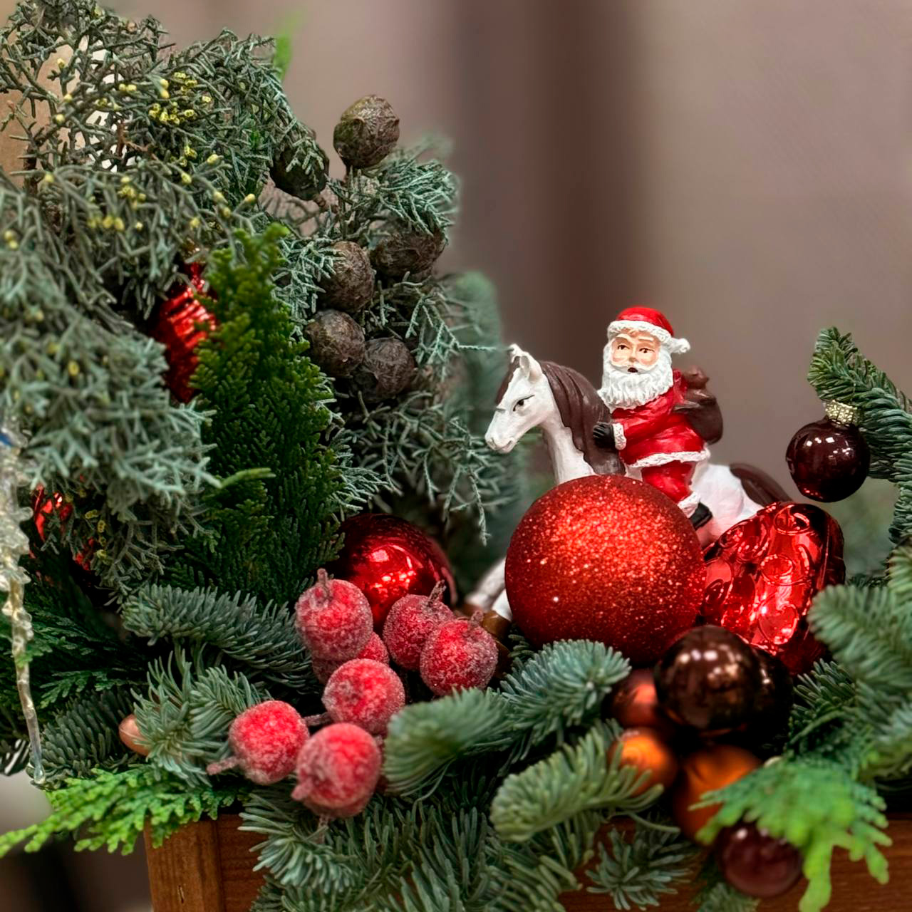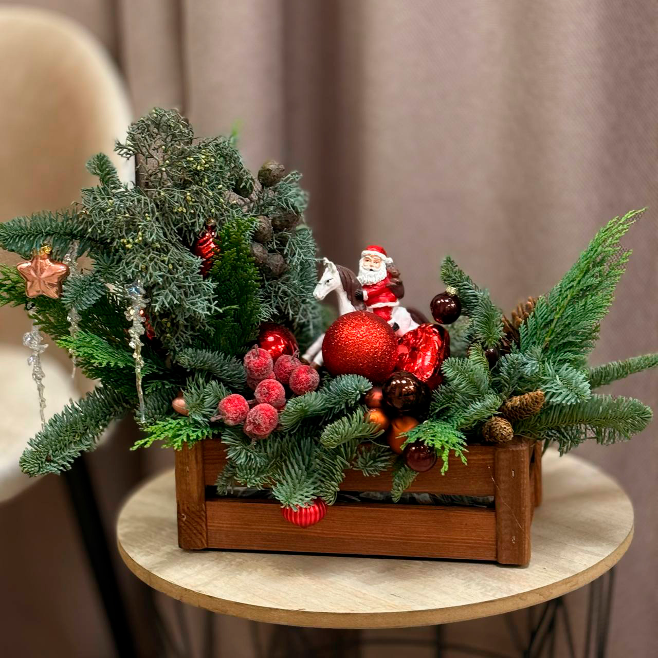Состав: илекс, пихта, новогодний декор, ящик и флористическая губка