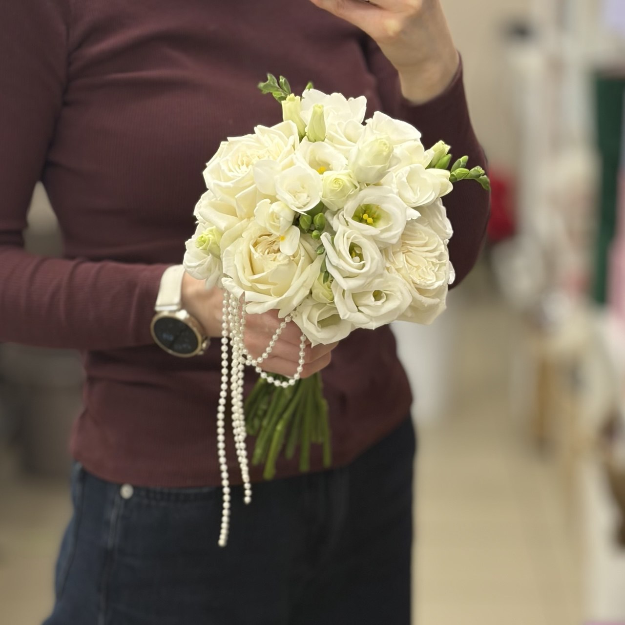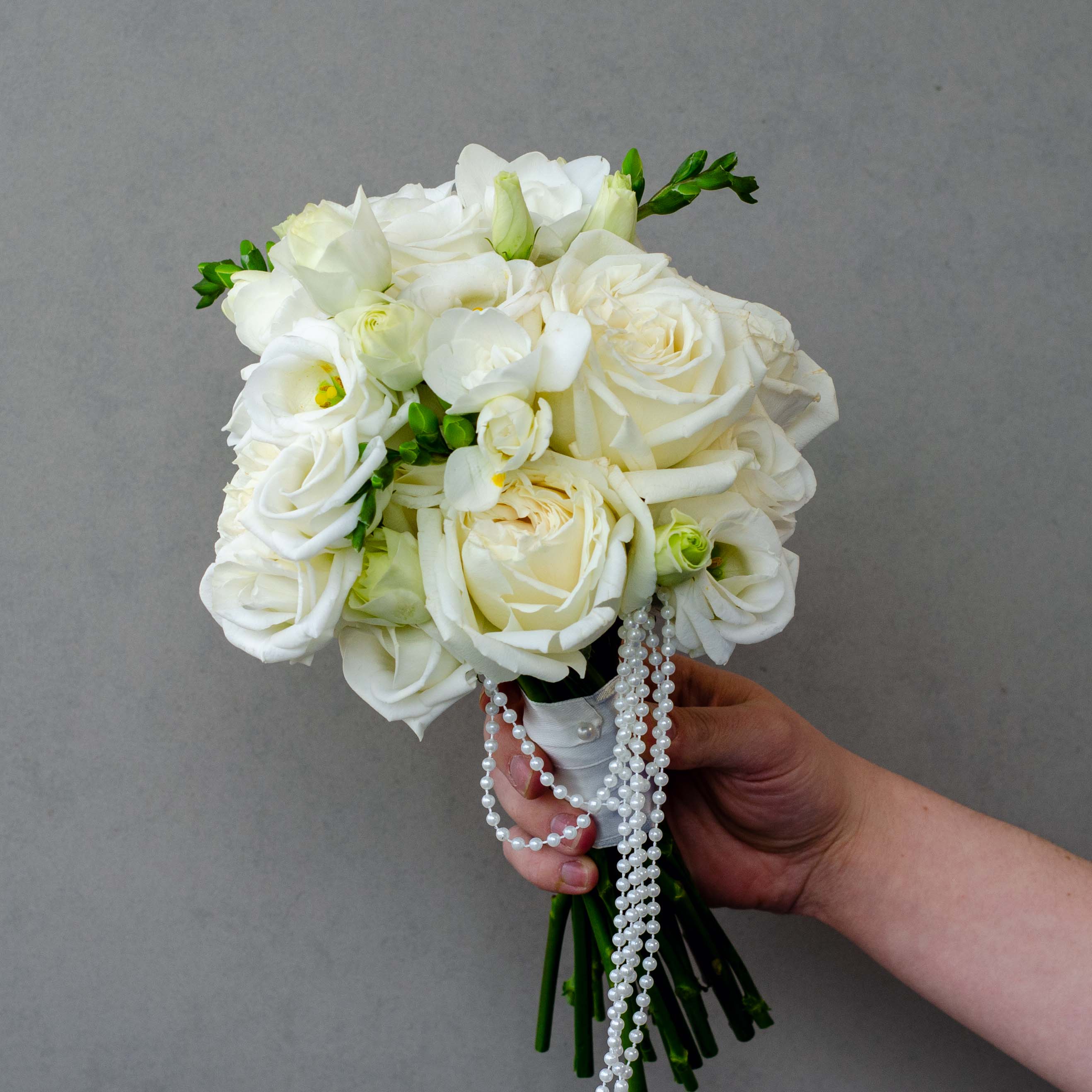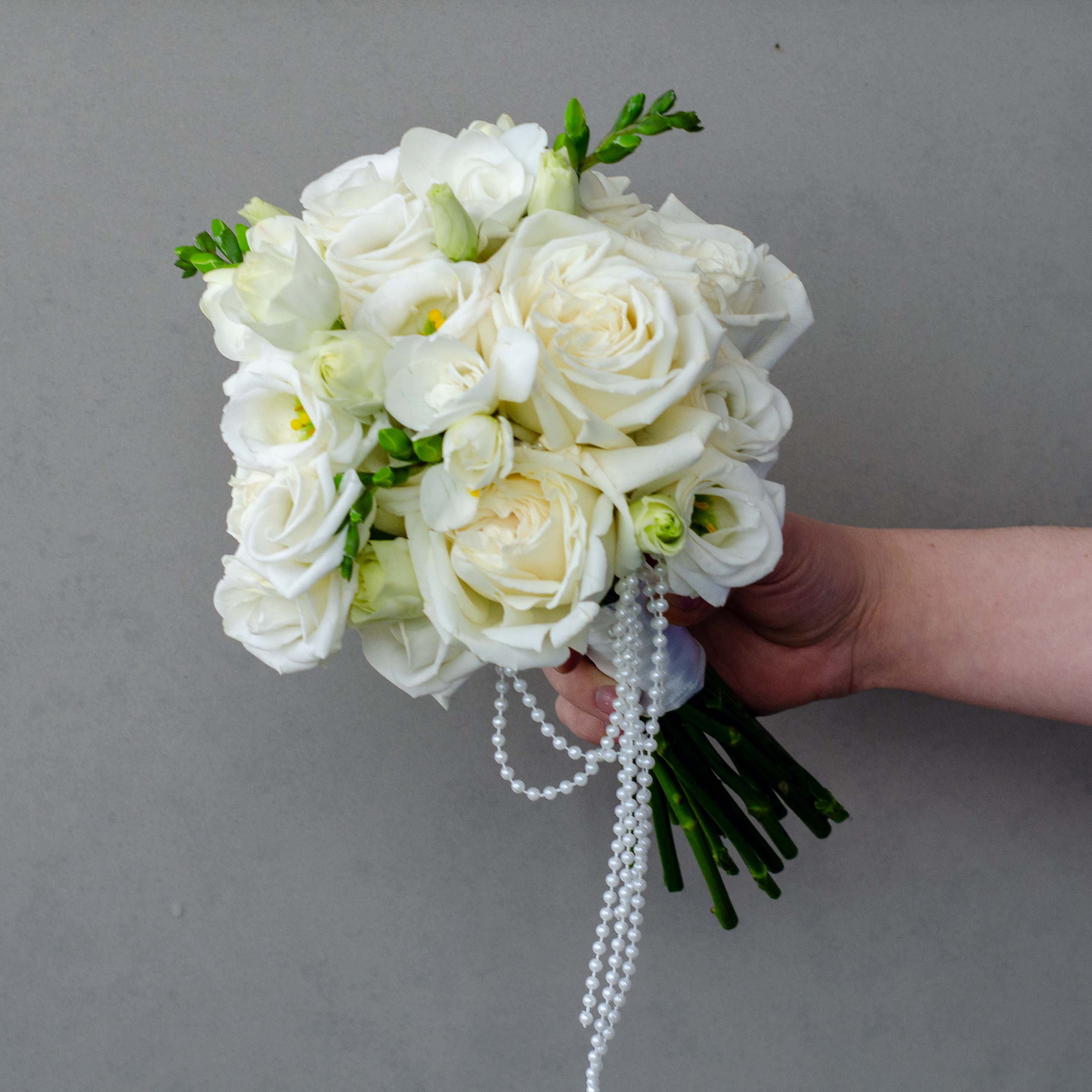 В составе букета 5 роз Плая Бланка, 3 эустомы, 3 фрезии и декоративные бусы и лента атласная
